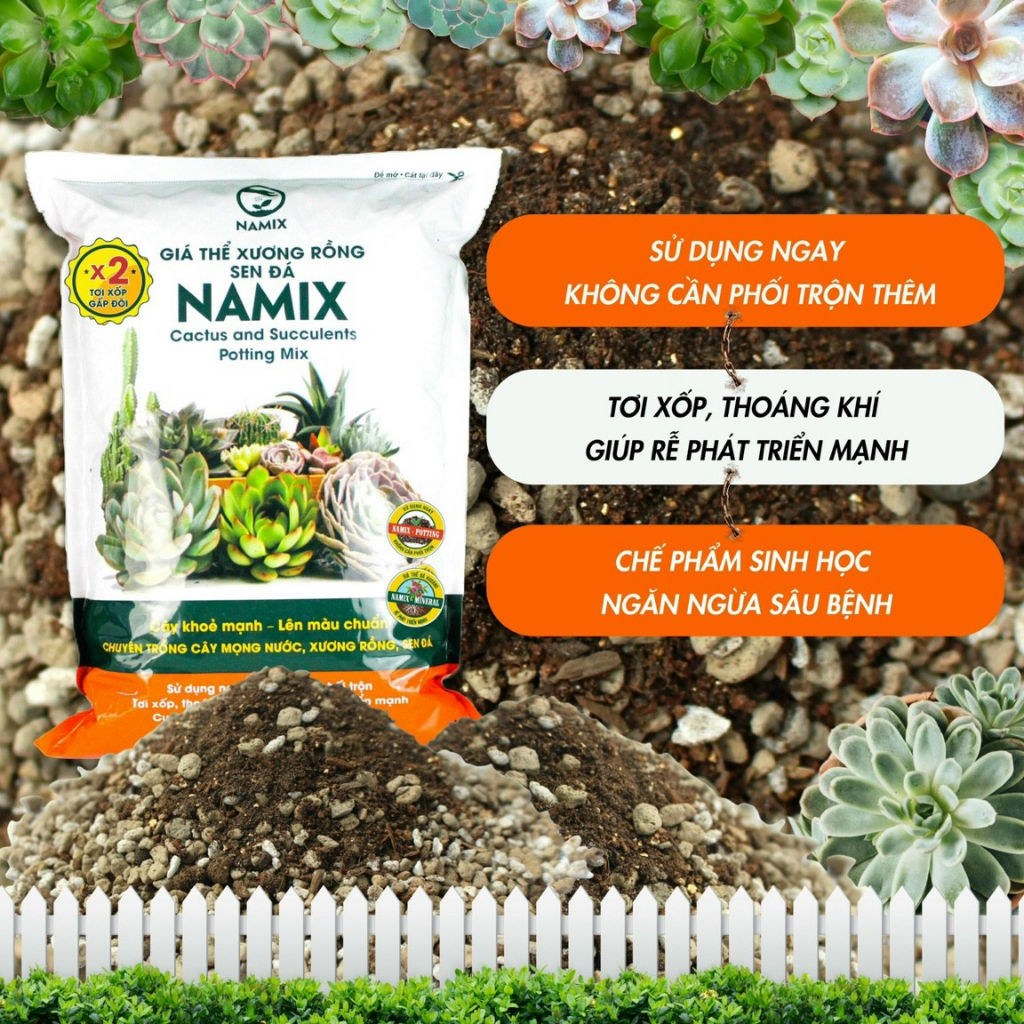 Đất trồng sen đá Namix là đất chuyên dụng để trồng sen đá, xương rồng, Trường sinh, Nha đam và các cây mọng nước khác. Với các thành phần như: đá perlite, xơ dừa, vỏ trấu,… bạn có thể trồng sen đá bằng đất Namix.