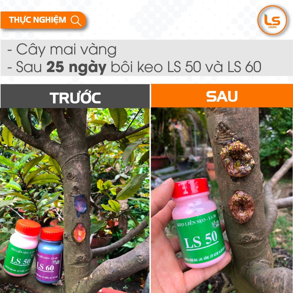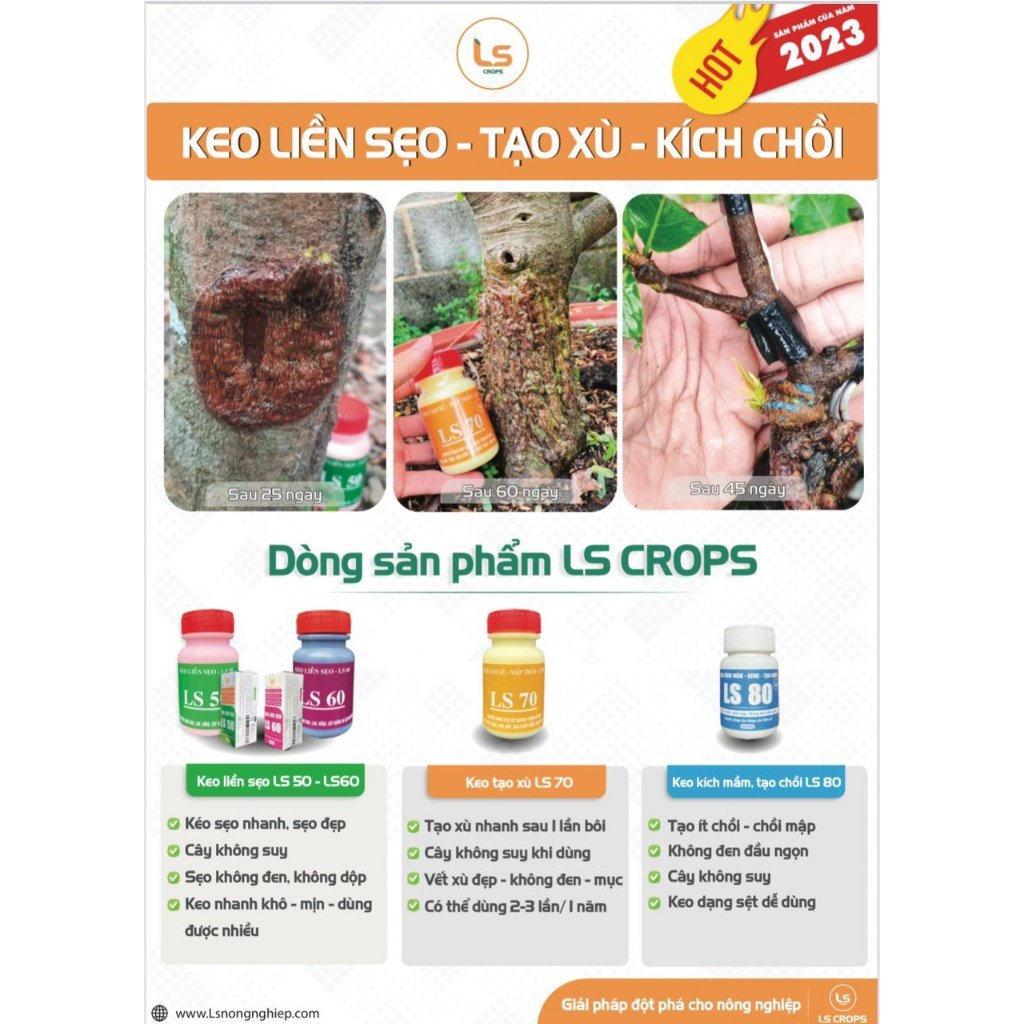 👉 Keo liền sẹo LS 60 có chứa hoạt chất tiêu diệt nấm và vi khuẩn gây bệnh từ đó hạn chế tối đa mặt cắt bị bệnh gây hiện tượng đen mặt cắt và thối rữa.